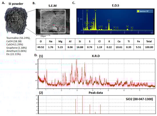 The SI powder was carefully fabricated by mixing tourmaline (56.24%; TaeYangBio, Buyeo-gun, Korea), CaOH (18.18%; Baek Kwang Mineral Products, Seoul, Korea), CaSO4 (1.29%; Serim Food, Bucheon-si, Korea), reduced graphene oxide (1.18%; Graphene Alpha, Jangsu-gun, Korea), amethyst (1.06%; Sejin, Gyeongju-si, Korea), and other materials (22.11%) as shown in Figure 1. A small sample of the resulting SI powder was used for characterization by scanning electron microscopy (SEM), energy dispersive spectrometer (EDS), and X-ray diffraction (XRD). For the cellular experiment, SI powder was flattened into a thin fabric (with width, height, and thickness of 90 mm × 130 mm × 5 mm, respectively) and set at 50 mm from the bottom of the culture plates for daily treatment in the incubator (ST180, Thermofisher, Merelbeke, Belgium), as shown in Figure 2A.