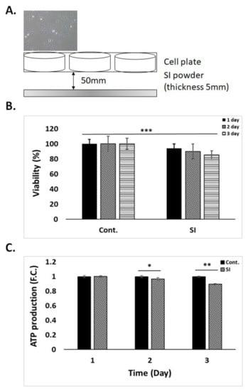 SI powder set-up and viability and ATP production: (A) SI powder block set beneath a cell plate to radiate FIR to cells; viability (B) and ATP production (C) of cells radiated to FIR for 3 days. Data are shown as the mean ± standard deviation (n = 3) after a two-tailed paired Student’s t-test (* p < 0.05, ** p < 0.01 and *** p < 0.001).