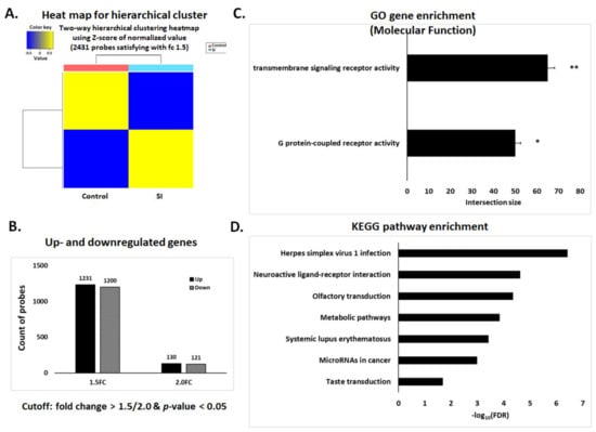 Following the observed SI powder effects on decreasing cell proliferation, the gene profile was examined by Clarion S Affymetrix Gene Chip analyses 3 days after SI powder exposure. Differentially expressed genes were identified by microarray analysis of significance (SAM; with a false discovery rate (FDR) < 0.05). Relative heat maps are shown in Figure 3A, where hierarchical clustering was generated by whole-transcriptional analysis-derived normalization of CEL files. By comparing sham-exposed and FIR-exposed cancer cells, we identified 2431 (fold change > 1.5) and 251 (fold change > 2.0) differentially expressed transcription clusters (1231 upregulated and 1200 downregulated, fold change > 1.5; 130 upregulated and 121 downregulated, fold change > 2.0; Figure 3B).