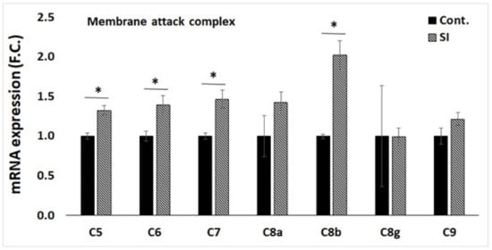 Based on the above results, transmembrane signaling receptors in the GO involve complement receptors, and systemic lupus erythematosus involves MAC signaling []. Among apoptotic pathways, we selected complementary MAC for mRNA expression analysis, which plays a key role in the innate and adaptive immune response by forming pores in the plasma membrane of target cells [,]. Next, we evaluated the expression levels of genes involved in the most upregulated pathways 72 h after SI powder exposure (Figure 4). In Figure 4, we observed a significant increase in the expression of C5, C6, C7, and C8β in FIR-exposed cells (C5, 1.32-fold p < 0.05; C6, 1.39-fold p < 0.05; C7, 1.46-fold p < 0.05; C8β, 2.02-fold p < 0.05), in accordance with our transcriptomic analysis.