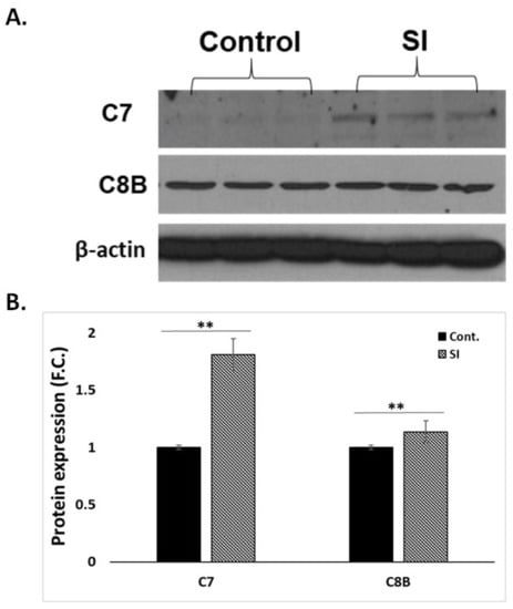 Next, we selected significantly expressed C7 and C8β genes for western blot analysis to confirm cellular inhibitory signals at the molecular level. Proteins C7 and C8β are soluble complement proteins in MAC. Protein C7 is a member of initiation in MAC and C8β is a member of polymerization in MAC. C7 was slightly expressed in cells exposed to SI powder, whereas C8β protein was well expressed in all samples (Figure 5A). The expression of proteins was quantified to compare between groups relative to that of β-actin protein. The C7 and C8β proteins were significantly highly expressed in cells exposed to SI powder than in control groups (C7, 1.81-fold p < 0.01; C8β, 1.13-fold p < 0.01; Figure 5B). These results were in accordance with the mRNA expression pattern.