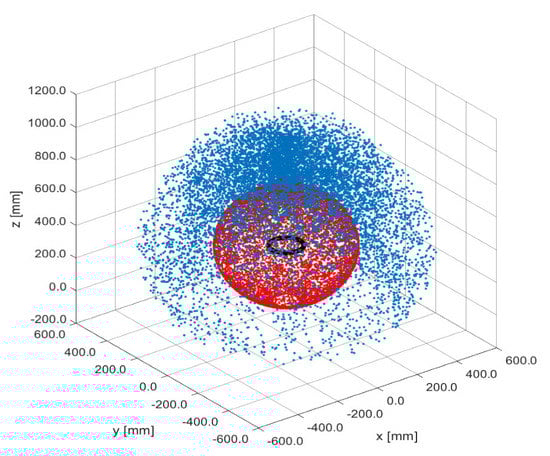 The 3D workspace of the IRB140 robot is shown in Figure 5, where the black scatter pattern is the J2 space, the red dots represent the J3 workspace, and the blue region describes the J4 space. It is noted that the complete workspace is reduced since the J1 axis is constrained within the frontal region at [π/2; −π/2] range from the Home-pose.