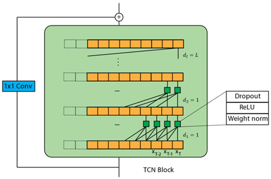 where represents the dilation factor, indicates the 1D convolutional window size, and denotes the direction of the past with kernel . However, to construct a deep model with the increased depth of the architecture to capture a more extended history based on the TCN, using skip connections is recommended [7]. Accordingly, the shortcut connections across layers were added to TCNs against the degradation problem, and accuracy saturates as the network converges.