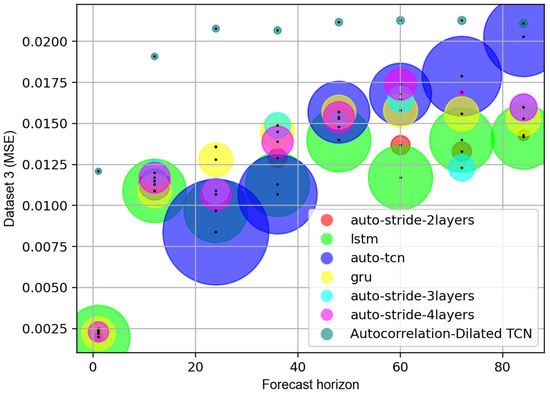 Comparison between models with respect to performance and complexity. The comparison is conducted on the CNU dataset. The x-axis depicts MSE error, and the y-axis depicts the forecast horizontal at eight milestones (1, 12, 24, 36, 48, 60, 72, and 84 h). A circle represents a model whose color represents its category, and the circle radius describes its complexity.
