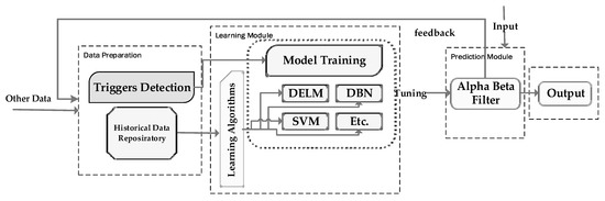 To deal with such problems, we proposed different learning models for application to prediction models. The learning models used DELM, DBN, and SVM. The prediction model used the α-β filter algorithm. These learning modules train data and tune in a prediction model to increase the prediction precision and the performance of the algorithm. The complete conceptual model is shown in Figure 1. In our proposed design, the learning module serves as a monitor for the retrieval of the output of the forecasting algorithm as a response, and it constantly observes the performance of the forecasting algorithm. The learning unit may also consider external constraints that may influence the α-β filter algorithm’s performance. The output of the prediction algorithm also analyzes the current external factors; the tunable parameters may need to be updated by the learning module to the prediction module or when environmental triggers are detected. The learning unit completely replaces the proficient model in the prediction algorithm to increase its performance with regard to prediction accuracy. The complete architecture of our proposed scheme is shown in Figure 2.