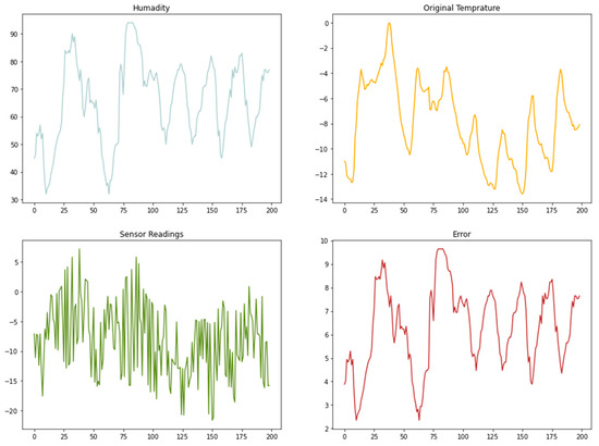 Experiments regarding a deep-belief-network-based α-β filter, a deep-extreme-learning-machine-based α-β filter, and a support-vector-machine-based alpha-beta filter were carried out on MSI DESKTOP-SC4U005. The computer has an “11th Gen Intel(R) Core (TM) i7-11700KF CPU @ 3.60 GHz, 32 GB ram, Nvidia Quadro M1200 4 GB graphics card, and MATLAB R2022a”. The implementation and simulation configuration are shown in Table 2. For the analysis of our models and the performance assessment of the multi-learning-algorithm-based α-β filter, we used the real weather dataset [2] of Korea and the data gathered by temperature and humidity sensors over three years, comprising hourly data with simulated noisy sensor readings, and some errors were added to the data. The total number of days for three years was 365 × 3 = 1095, and there were 26,280 total data instances. Initially, when the filter-readings sensor obtained values via the typical method, the root mean square error, a value of 5.21, was obtained, which is very high in terms of the RMSE. By using these three algorithms, we attempted to reduce the error. The data representation is shown in Figure 6.
