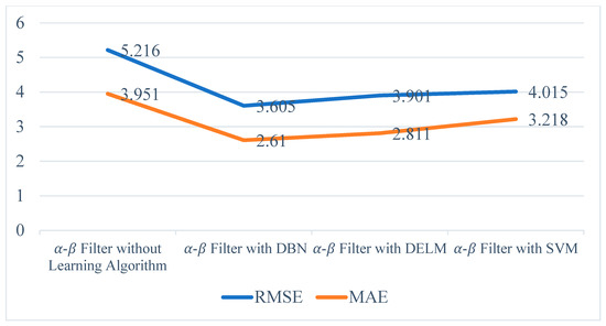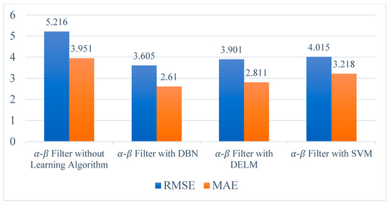 Table 3 shows comparisons of the different algorithms’ performances; we reached the conclusion that the DBN algorithm prevails compared to the DELM and SVM when applied to the alpha-beta filter. Figure 12 and Figure 13 show the comparison of the typical alpha-beta filter and the proposed multi-method in terms of RMSE and MAE.