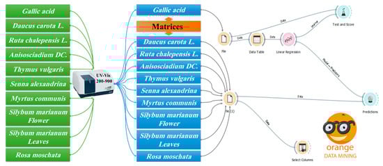 ODMT is a data-mining tool that is useful for visual programming and exploratory data analysis that can be written in Python. Orange has many components known as widgets. Each widget includes some tasks of data retrieval, preprocessing, visualization, modeling, or evaluation. The combination of different user interface elements in a workflow allows users to create comprehensive data analysis charts on the go with a large library of tools [30,31,32,33]. This study proposes a comparison of the Folin–Ciocalteu method [13], and prediction methods in the ODMT are used in this study for analysis and prediction of TPC in the plant extracts. The methodology flow used in this study is illustrated in Figure 1. In this Figure, the program was designed using prophecy models that are present in Orange software to extract the desired results, which are the TPC from a bunch of plant extracts.