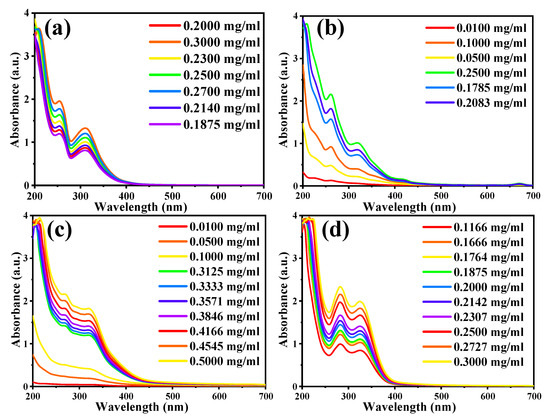 UV-Vis absorbance curve of the plant extracts at different indicated concentrations: (a) Daucus carota L. (root), (b) Ruta Chalepensis L. (Leaf), (c) Anisosciadium DC. (Leaf), and (d) Thymus vulgaris L. (Leaf).