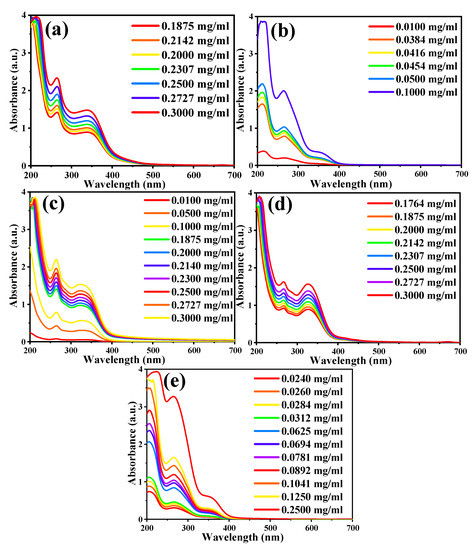 UV-Vis absorbance curve of the plant extracts at the different indicated concentrations: (a) Senna alexandrina, (b) Myrtus communis L. (Leaf), (c) Silybum marianum L. (Flower), (d) Silybum marianum L. (Leaf), and (e) Rosa moschata L. (Flower).