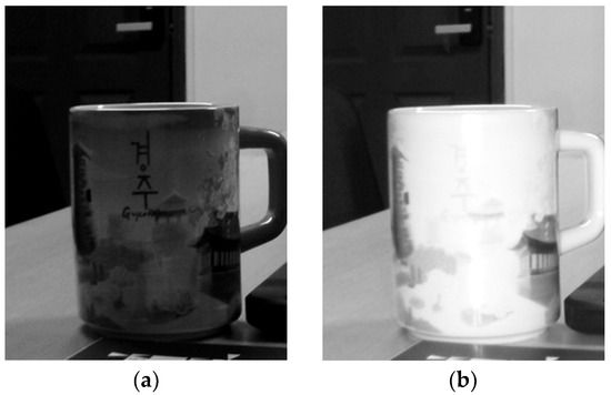 However, when the two images are synthesized using a bilateral filter map to preserve the strong boundaries of the object, the results include distorted objects because the object details are reflected in the synthetic map, as shown in Figure 6c. In the low-brightness areas of visible light, the synthetic ratio of near-infrared images is increased, and the high-brightness areas of near-infrared images are excessively synthesized in dark letters. When creating a synthetic map using a joint bilateral filter, the strength of near-infrared images is reflected in the visible-light low-brightness areas, which increases the ratio of near-infrared images. Therefore, the VIS-IR joint bilateral filter, which includes the boundary information of the near-infrared image of Equation (7), was used.