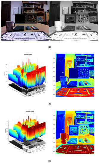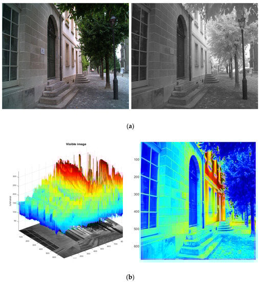 The wavelength band of light that can be visually recognized is 400–800 nm, and the wavelength band of nighttime infrared auxiliary light is approximately 800–1500 nm. Near-infrared rays experience a low degree of scattering effect by particles in the atmosphere; therefore, there is a region with strong object contrast and sharpness. Considering these characteristics, both visible-light and near-infrared images can be captured and the improved images may be fused and reproduced. Visible-light and near-infrared image synthesis measures information visibility primarily through the local contrast of visible and near-infrared images and controls the synthesis ratio so that the boundaries and textures of the entire image are maximally expressed. In particular, it can be used to accurately judge the edge of an object by synthesizing visible and near-infrared images not only at night but also in fog, smoke, or shaded areas during the daytime [1,2,3,4,5].