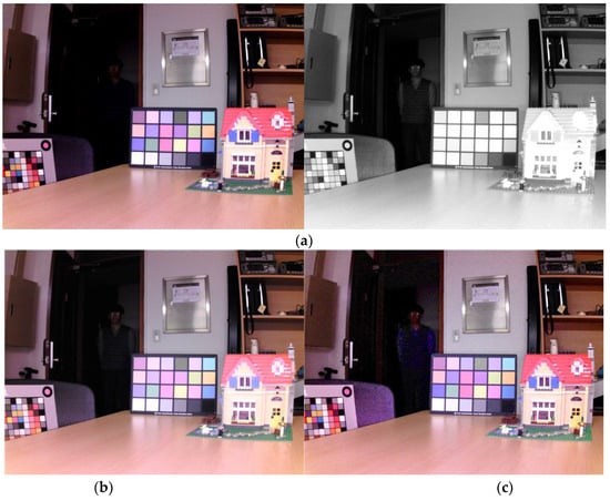 In the nighttime visible-light image, the border information is weak for shaded areas, such as the box in Figure 9b, and has a low luminance value on average. In contrast, in the nighttime near-infrared Figure 9c, IR auxiliary light complements the lack of light in the box and secures the boundary information of the color chart in the box. However, unlike natural light, auxiliary light is weak in long-range IR infiltration and diffusion, and short-range luminance saturation caused by the front filter of the IR flash is relatively strong. This can be confirmed by the characteristics of the night image using the auxiliary light and the change in the luminance in the cup area where saturation occurs when comparing the box and the cup area in Figure 9d. Therefore, brighter daytime visibility and near-infrared car images reflect IR light penetration, and brighter visible-light and near-infrared car images show anterior luminance saturation by IR auxiliary light. To synthesize the characteristics of these day and night images, an IR depth compensation map was applied at night, and a penetration compensation map was applied during the day.