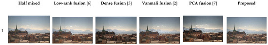 Figure 13, Figure 14 and Figure 15 show the synthesis results for the daytime images. Compared with the Densfuse synthesis method, it is confirmed that the proposed method has excellent visibility of detailed information in the area because the luminance range of the base layer is well-compressed in the shaded area of the visible-light image. In addition, in the Vanmali and PCA synthesis method, colors are shown differently than in the original image, such as a strong red color, over-saturation symptoms, and mismatched white balance throughout the image, including buildings and roofs. In contrast, in the proposed method, the original color of the visible-light image is naturally expressed without oversaturation. In addition, it can be confirmed that the proposed method expresses detailed information better than the two existing synthesis methods in the details of the mountain in Figure 13, the boundary information of the leaves in Figure 14, and the details of the wave in Figure 15.