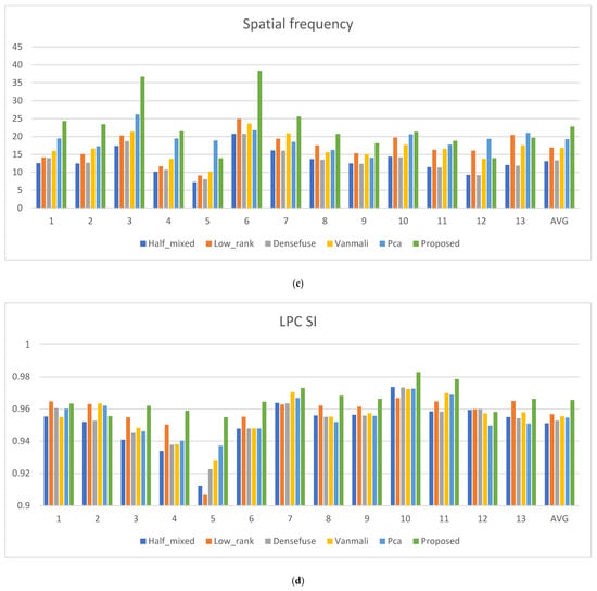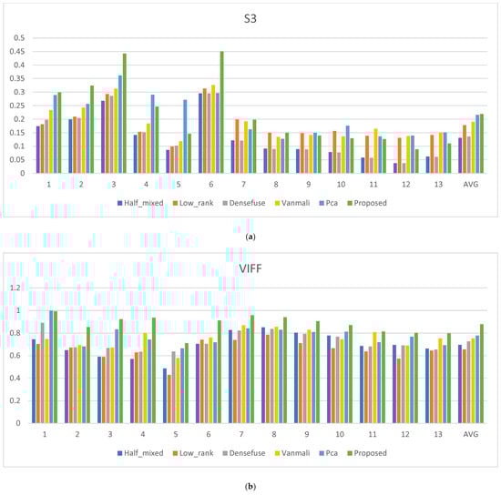 Spectral and spatial sharpness (S3) generates a sharpness map considering human cognitive characteristics, and a larger local value indicates a visually sharper area. This is used to evaluate the quality and sharpness of the images in general [15]. Visual information fidelity for fusion (VIFF) is a quality metric that measures the effective visual information of fusion in all blocks in each sub-band. This is obtained by using the VIF models to gather visual information from the source and fused image pair [16]. Spatial frequency (SF) is used to observe the distribution of gradients throughout the image by calculating vertical and horizontal gradients and to evaluate the amount of detail and texture that can be perceived by humans [17]. LPC-SI is an image sharpness evaluation index that uses the fact that strong local phase coherence occurs in objects or regions that visually stand out in the complex wavelet transform domain [18]. Edge intensity (EI) is an image evaluation method based on the idea that high edge intensity values are superior in terms of image quality and sharpness [19]. The average gradient (AG) metric quantifies the gradient information in the fused image and reveals the details and textures [20]. Regarding the evaluation indicators S3, VIFF, SF, LPC-SI, EI, and AG used in this evaluation, the higher the performance evaluation value, the better the performance in terms of image quality and sharpness.
