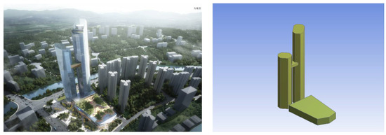 This paper takes an actual building as an example. The specific building tower A was 270 m high, and tower B was nearly 200 m high, both of which were rigidly connected by a sky-link, with a complex structural system (as shown in Figure 1). In addition, the shortest distance between towers A and B was only 13 m, resulting in complex aerodynamic interference effects between the two towers. In order to compare with the aerodynamic noise wind tunnel experimental results, the numerical simulation model and the wind tunnel model were of the same height, both with a scaling ratio of 1:1500 and a maximum height of 18.5 cm.