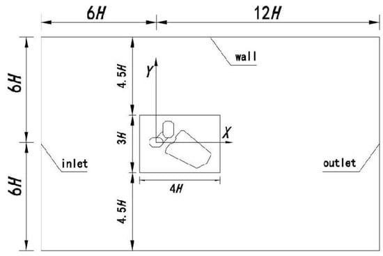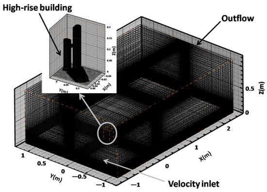 Geometry was used to model the computational area in ANSYS, followed by ICEM for meshing and setting boundary conditions. The blockage rate, the ratio of the maximum windward area of the building to the cross-sectional area, is an important indicator to determine whether the dimensions of the computational domain can meet the computational needs. The blockage ratio is required to be less than 3% in numerical simulations [17,18]. Due to the irregularity of the model, the grid was divided into two computational regions, namely inner and outer basins (as shown in Figure 2). The outer basin was 3.6 m long, 1.2 m wide and 1.2 m high, and the inner basin was 0.8 m long, 0.6 m wide and 0.2 m high. The building model was placed inside the inner basin, with the blockage rate of 2%, thus meeting the simulation requirements. The meshing was performed in ICEM software. The unstructured grid was used for the inner basin containing the building due to the irregular structure of the building, and structured grid was used for the outer basin. The grid growth rate was controlled to locally encrypt the grid of the building surface (as shown in Figure 2). In order to obtain more accurate results, the boundary layer of the building model was set. The first grid height of the building model walls was 2 × 10−4 B (B is the minimum size of the building model after scaling), which was in accordance with the minimum grid size used by Liu et al. [19] in their simulation research on buildings. There were a total of around 4 million meshes in calculation domain under each working condition, with around 2.5 million nodes. The specific settings are shown in Figure 3.