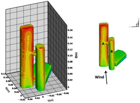 As can be seen from Figure 11, the numerically simulated sound source localization at low wind speed at the wind angle of 270° was in good agreement with the acoustic wind tunnel experimental results. The deviation of the upper localized sound source location under the working conditions of 35 m/s and 40 m/s was caused by the complex modeling of the apron in the upper part of the building, which was simplified in the numerical simulation by reducing the apron to a regular solid figure, but 3D printing technology was adopted in the wind tunnel experimental model to reproduce the external contour of the complex structure at the top. The total height of the two models was the same, whose appearances were identical except for the detailed structure as well as the top layer structure (as shown in Figure 12). In addition, the sound pressure level amplitude of the sound source was in good agreement.
