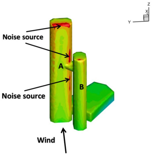 Therefore, the numerical simulation method combining large-eddy simulation and FW-H proposed in this paper can reasonably simulate the aerodynamic noise distribution on the surface of the building and locate the noise source. Furthermore, the sound pressure level spectrum was further analyzed to improve the parameter settings of the numerical simulation details.