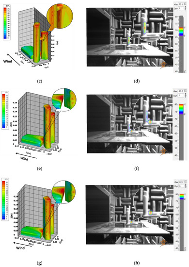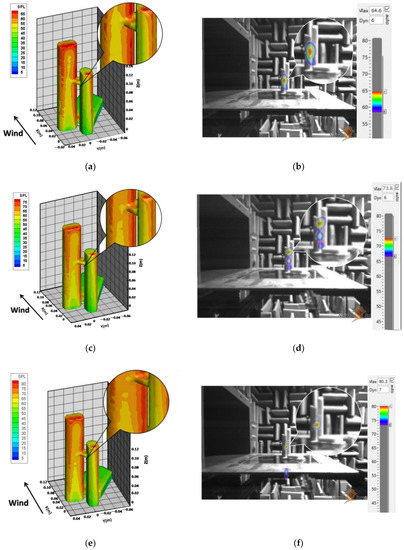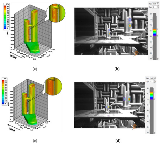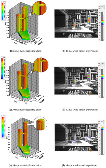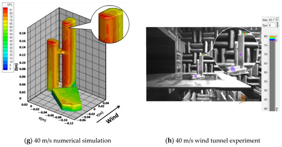 It can be seen from Figure 7 that the numerically simulated sound source localization at the wind angle of 0° at each wind speed was in good agreement with the acoustic wind tunnel experimental results, as was the sound pressure level amplitude of the sound source.