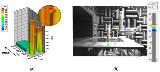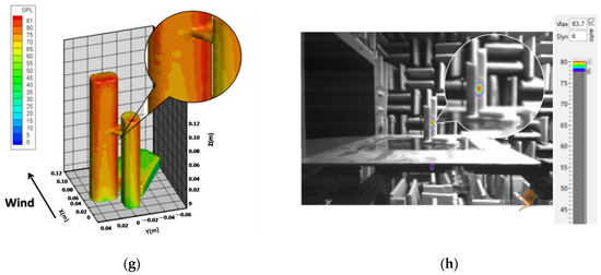 From Figure 9, it can be seen that the numerically simulated sound source localization at the wind angle of 90° at each wind speed was consistent with the acoustic wind tunnel experimental results in the height direction, as was the sound pressure level amplitude of the sound source.
