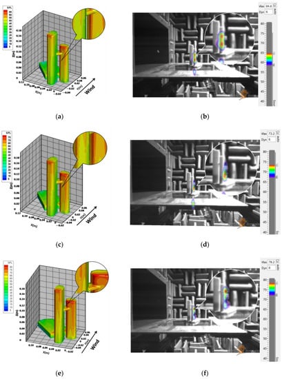 The above figure shows that in terms of amplitude, after placing the model in Figure 14b, the overall amplitude of sound pressure increased relative to the background sound pressure in Figure 14a, which was attributed to the background noise sound pressure superimposed on the building surface aerodynamic noise. In terms of pulsation frequency, after placing the model in Figure 14b, the sound pressure pulsation frequency increased significantly in the high-frequency band relative to the background sound pressure in Figure 14a. Therefore, it can be assumed that the pulsation sound pressure in the high-frequency band was mainly influenced by the aerodynamic noise on the surface of the building model.