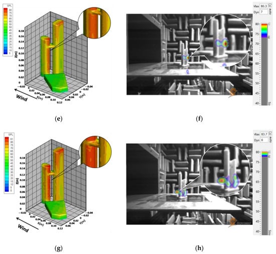 Comparison of experimental and simulated sound source localization at the wind angle of 90°. (a) 25 m/s numerical simulation; (b) 25 m/s wind tunnel experiment; (c) 30 m/s numerical simulation; (d) 30 m/s wind tunnel experiment; (e) 35 m/s numerical simulation; (f) 35 m/s wind tunnel experiment; (g) 40 m/s numerical simulation; (h) 40 m/s wind tunnel experiment.