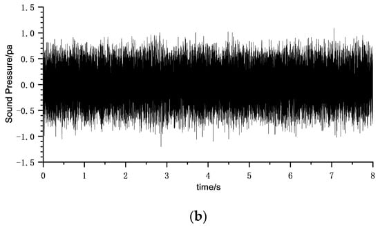 Time course of sound pressure before and after placing the model at the wind speed of 30 m/s. (a) 30 m/s wind tunnel sound pressure time course without model; (b) 30 m/s wind tunnel sound pressure time course with model.