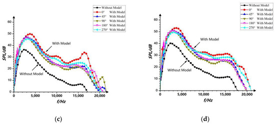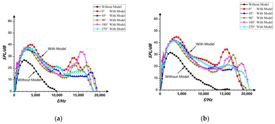 The fast Fourier transform was performed on the sound pressure time course to obtain the sound pressure level spectra under each working condition, which were then sliding averaged [30,31,32]. The finite adjacent values of the experimental data with and without the model were respectively averaged to suppress the influence of random errors on the experimental results, as shown in Figure 15.