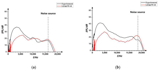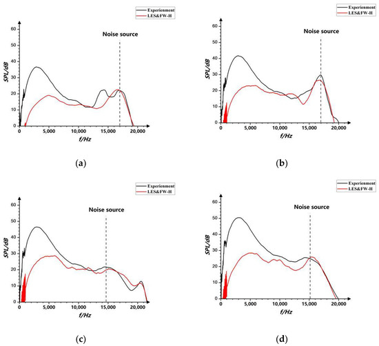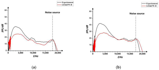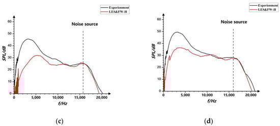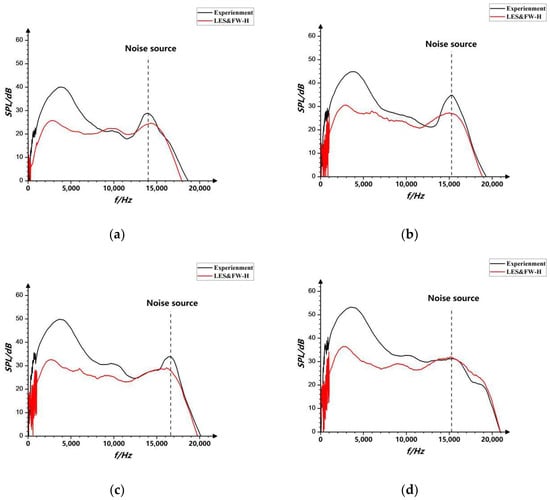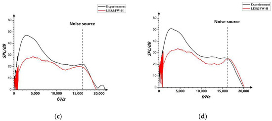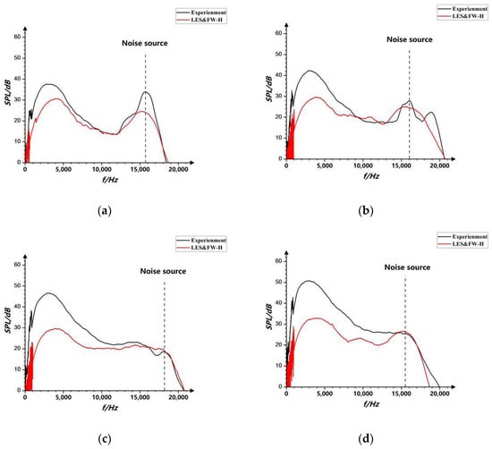 The time course of sound pressure pulsation was collected, and the sound pressure level spectrum data of each point was obtained by fast Fourier transform (FFT) and then compared with the acoustic wind tunnel experimental results for verification, as shown in Figure 16, Figure 17, Figure 18, Figure 19 and Figure 20.