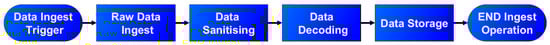 We outline the different types of data ingest processes that allow integration with different IoT cloud platforms. These integrations utilize either the (i) Hypertext Transfer Protocol (HTTP)—an application-layer protocol for transmitting hypermedia documents, (ii) Websocket—a computer communications protocol that allows full-duplex communication, or (iii) MQTT—a lightweight open messaging protocol to communicate and operate using periodic and event-based triggers. The procedure for data ingest for a typical IoT device is shown in Figure 3. It is a pipeline model that demonstrates the flow of data into and out of the ingest system from a range of IoT cloud platforms and into a data storage system. The proposed model is a trigger-based mechanism that supports both push and pull-type data retrieval mechanisms and allows for near-real time updates of sensor data. The trigger-based model enables the data integration system to accept connections from or to interact with any style of API or IoT messaging technology such as MQTT, HTTP, and WebSockets. For example, if Cloud Platform in Figure 1 publishes data from Sensor Type A to an MQTT topic on a vendor-managed MQTT broker, the data ingest system can then subscribe to this topic to receive messages into the pipeline shown in Figure 3. At the end of the ingest operation, data have been stored and can be utilized by the end-user applications such as visualization in a dashboard. A detailed description of raw data ingest, data sanitizing, decoding, and storage can be found in Appendix A.