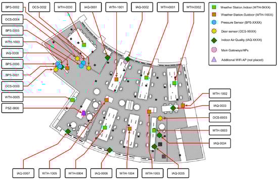 An example of an open plan office with sensor locations.