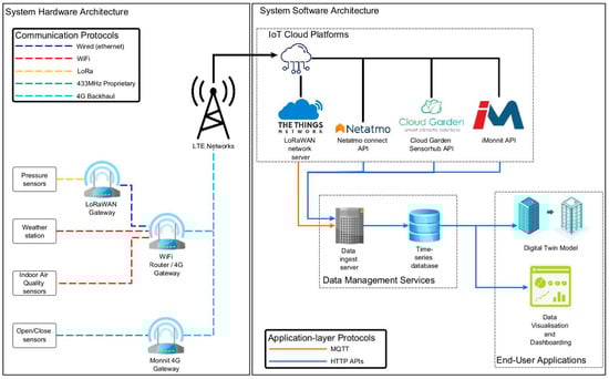 Following the selection of sensor devices, a suitable system hardware and software architecture were designed for the end-to-end data collection system. This end-to-end architecture, shown in Figure 5, describes all elements of the monitoring system including network access technologies and required access points or gateway devices, internet backhaul elements, device-specific cloud storage or management platforms, the unified data management system, and potential end-user applications.