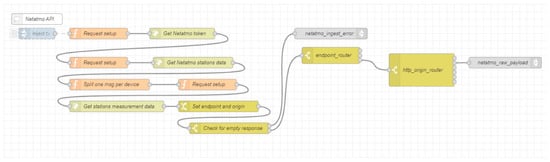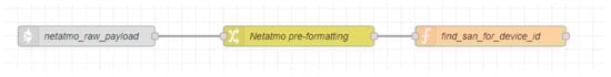 Utilizing the pipeline model for data ingest in Figure 3, a sample of the Node-RED flow was developed as shown in Figure 6. The raw data ingest stage for the Netatmo weather stations was set up before the payload was sent to the payload sanitizing flow.