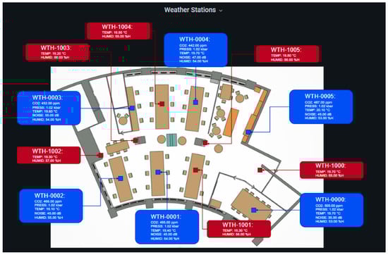 The data collected during the monitoring period were integrated into a Grafana dashboard to display the key sensor readings. The dashboard was formatted in a manner that made it simple to identify the sensors, their readings, and locations relative to the worksite. A sample of the dashboard for the office site is presented in Figure 9.