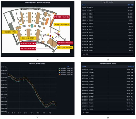 For the purposes of this study, the data were presented on a dashboard with key values highlighted using Grafana—an open-source web application for data analytics and interactive visualization. The Grafana dashboard was connected to InfluxDB alongside user-made plug-ins to develop the panels containing the floorplans with sensors. The dashboard presents the data in three formats, firstly the floorplan format in which an image of the open plan office is overlayed with sensor locations. Each sensor displays the latest reading. Secondly, a graph of the time-series data shows the historical data for the selected time period for one parameter. Thirdly, a table format shows the time-series data of the Monnit ALTA open/close door sensors and SenseCap Barometric Pressure sensors. Since the door sensors are event-driven (i.e., when there is a change in state) the panel will show the date and time that the current state has changed from open to close and vice-versa.