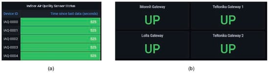 The storage and ease of access of sensor data in the implemented system by other users are a key design aspect of the entire sensing and data collection system. For this, we chose to use the InfluxDB time-series database platform. While the traditional databases allow flexible index types, the sensor data being collected in an IoT-based IAQ monitoring system is inherently associated with particular timestamps among other parameters. Previous studies [31,32] have raised concern that as IAQ monitoring applications largely deal with continuous real time-series data, the use of a database, which was optimized for time-series data, is crucial for efficient and easily accessible data to conduct post-processing and analysis. In this study, the InfluxDB has been optimized for the querying of data via its “tagging” mechanism that indexes tags for each record alongside timestamps. Such a mechanism means that heavily repeated parameters found in a database such as Device ID, sensor type, and other constants can be used to quickly filter and sort data during query operations.