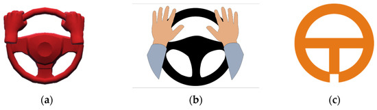 RtI icons tested in the ITS laboratory: (a) “red hands on steering wheel” icon, (b) “natural hands on steering wheel” icon, (c) orange wheel icon.