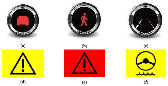 RtI icons tested by Solaris: (a) red car icon (MobilEye), (b) red pedestrian icon (MobilEye), (c) leaving-the-lane icon (MobilEye), (d) warning triangle in yellow (Solaris), (e) warning triangle in red (Solaris), (f) steering wheel in yellow (Solaris).