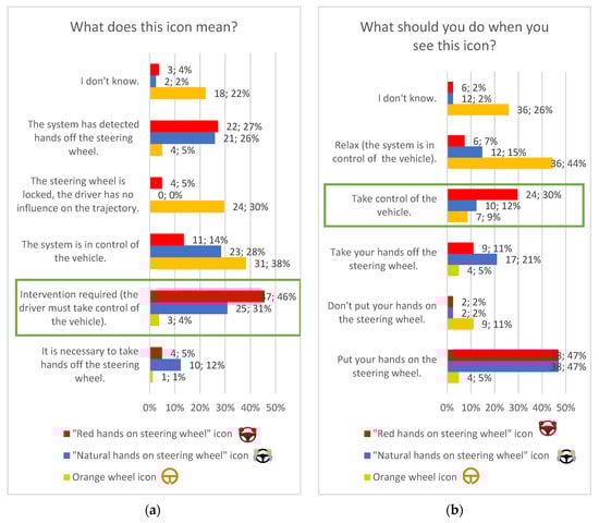 The results of the CT (comprehension test) are shown below. Figure 3 provides information about the understanding of the RtI message conveyed by each of the icons presented in Figure 1. Correct answers are marked with a green rectangle. Almost half of the respondents stated that the “red hands on steering wheel” icon warned about the need to intervene, and this was the best result. Somewhat fewer participants, 31%, indicated that the same icon in natural color signaled RtI. The drop in comparison to the red icon may be due to drivers becoming accustomed to the way information is encoded on the dashboard. According to ISO 2575 “Road vehicles—Symbols for controls, indicators, and tell-tales” [26], red color is used to warn drivers. This type of lighting informs them about the car’s potential problem, safety issues, or immediate failure points. On the other hand, the orange wheel icon was not regarded as RtI-signaling. Respondents tended to think that the symbol suggested driving in automated mode, the system is in control of the vehicle (38%), locked steering wheel (30%), or had no idea what it meant (22%). This is also reflected on the right panel of Figure 3, showing that drivers either had no idea what they should do when noticing such a symbol (26%) or thought they should relax because the vehicle was in automated mode (44%). Both answers were incorrect.