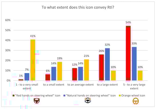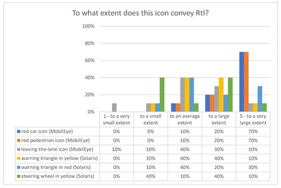 The participants were then asked to specify to what extent the presented icons conveyed RtI (Figure 7). For this purpose, a simple scale from 1 to 5 was used, where 5 was the highest rating. The results show that the red car and the red pedestrian are the best pictograms. They clearly show that a dangerous situation is imminent (red color) and, at the same time, define the type of threat. The average rating given to these icons is 4.60. The third place also belongs to an icon in red, a warning triangle on a red background, with an average score of 3.70 (−0.90). The same pictogram on a yellow background scored 3.50, while the lane departure icon and the steering wheel icon were rated the worst (3.20 in both cases). Based on these and previous results, these two icons cannot be regarded as correctly representing RtI.