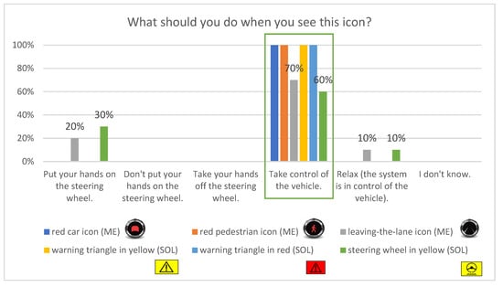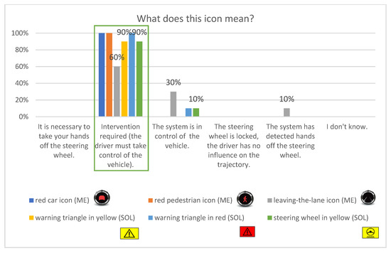 Figure 5 and Figure 6 provide information about the understanding of the RtI message conveyed by each of the icons presented in Figure 2. Correct answers are marked with a green rectangle. All the icons turned out to be comprehensible to the drivers. The most problematic one was the lane departure icon (implemented in MobilEye). Only 60% of the participants understood its meaning, while the others read its message as “the system is in control of the vehicle” (30%) or “the system has detected hands off the steering wheel” (10%). Both yellow icons (designed by Solaris) scored high on comprehensibility (90% each), but it is worth noting that 10% of drivers understood them as conveying the opposite of their intended message (“the system is in control of the vehicle). The same icon in red had a 100% level of comprehension, which may be related to the meaning of red in the automotive industry.