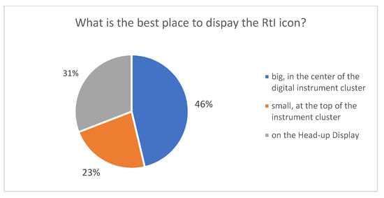 The purpose of this research was to check how drivers understood the warnings conveyed by new pictograms used to inform them about the immediate need for the human driver to take back control of the vehicle. The results clearly indicate that using ISO 9186-1 [19] could improve the process of introducing new visual HMIs, including icons and dynamic information, facilitate the implementation process, and enhance user experience with new ADAS technologies. This supports the results reported by Campbell et al. [3] and justifies further implementation of this method in ADAS testing and development. From the perspective of users’ needs and preferences, this research indicates that for safety-critical signals, such as RtI, users prefer the red color. This might be connected with the typical coding rules for safety signs, namely, the ISO 3864 series [27], where various levels of urgency are indicated by yellow, orange, and red. This might also stem from people’s habituation to these rules being observed in other areas of life as well. On the other hand, while participants of our research fulfilled the same questionnaire, it might have an influence on the interpretation of the results. Nevertheless, our results clearly emphasize that the randomization of questions would not affect the results to a meaningful extent.