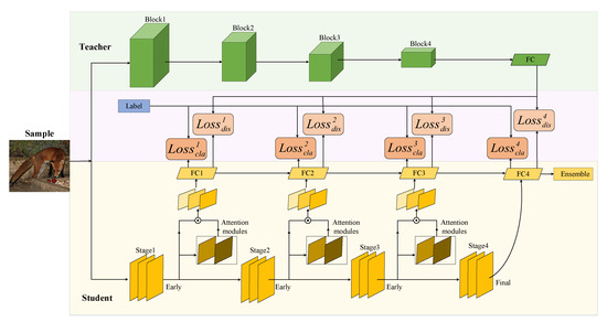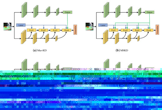 where denotes the output of the probability distribution of the k-th exit of the teacher network after softening. As can be seen with the above description, the main difference between Equation (5) and Equation (8) is the source of guidance of the teacher network, one is the final output of the teacher network with the specific formula in Equation (5) and the other corresponds to the output of the teacher branch network with the specific formula in Equation (8). Therefore, the overall loss of the student network can be expressed as: