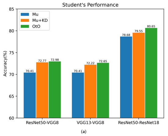 To demonstrate the effectiveness and robustness of the proposed method, we compared it with other mainstream KD methods for the CIFAR100 and Tiny ImageNet datasets, and the experimental results are shown in Table 4 and Table 5. All KD methods can improve network performance to some extent, as seen by the statistics presented in the tables. However, not all improved KD methods consistently outperform conventional KD methods under different teacher–student structures. The proposed method consistently outperforms the traditional KD methods under a variety of teacher–student architectures for both datasets. In addition, the student network outperforms the teacher network in certain teacher–student architectures. Specifically, for a ResNet18 student trained by a ResNet50 teacher on CIFAR100, the proposed method results in a 2.7% improvement in the student network performance, and the accuracy of the student network is 1.83% higher than that of the teacher network. The OtO method, which is an extension of MSKD, further improves the accuracy, its performance is slightly worse than the SOTA distillation method HSAKD when the teacher network is ResNet152, but is excellent with the rest of the teacher–student architectures. The SOTA HSAKD [28] method augments data for self-supervised learning, and data augmentation aids its effectiveness. Furthermore, we used the AutoAugment [40] strategy in OtO, and Table 4 shows that the proposed method superior to the previous KD method at this time.