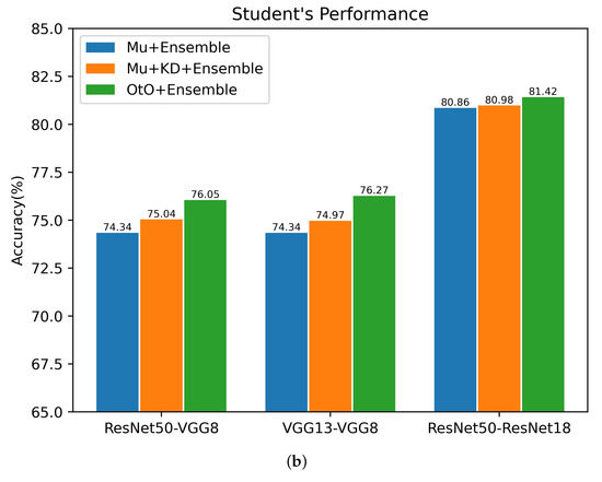To verify the effectiveness of each part of our OtO method, several teacher–student architectures are selected to conduct an ablation study for CIFAR100. Overall, we explored the following: (i) a multi-exit architecture network (Mu) using only classification loss, i.e., setting in Equation (5) to 0; (ii) applying a conventional KD method on a multi-exit architecture network(Mu+KD), i.e., only the final exit of the multiple-exit student network architecture receives guidance from the original teacher network; (iii) OtO and the use of ensemble learning in the above three training modalities. The experimental results are shown in Figure 4. As shown in the figure, the multi-exit architecture student network with only one last exit to receive guidance from the teacher network improves the accuracies of the single last exit and ensemble learning. This illustrates the effectiveness of KD applied to multi-exit architectures. Furthermore, our proposed method is substantially better than the original multi-exit architecture network and conventional KD method, which indicates that a multi-exit architecture teacher–student network for one-on-one instruction stimulates the learning ability of the student network and results in a greater amount of knowledge. As shown in Figure 4b, in several teacher–student architectures, the accuracy is eventually improved by the ensemble, which illustrates the practical relevance of the ensemble for combining multiple stages. In conclusion, our proposed method can achieve better results using the ensemble.