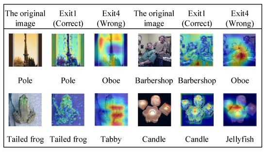 Relevant experiments were conducted to illustrate the differences in the classification performance of each exit. Herein, we choose ResNet34 and ResNet18 as the teacher and student network, respectively, for the Tiny ImageNet dataset and explore the samples that are correctly classified for each exit. The results reveal that the samples classified correctly in each exit are not identical, and there are cases in which samples classified correctly at the earlier exit are misclassified at the later exit. Figure 5 shows a set of samples that are correctly classified at the first exit only. Grad-CAM [51] can be used to visualize the importance of this set of samples at the first exit versus that at the last exit in the prediction process for each position of the image for the corresponding class. Notably, the first and last exits are concerned with the general structure of the input image and image details, respectively. The candle sample in Figure 5 is an example in which the first exit focuses only on the simple structure of the candle to arrive at the correct classification. In contrast, the final exit focuses on the image details. More specifically, the final exit only focuses on the local information of the candle, which results in the classifier mistaking the image for that of a jellyfish and finally misclassifying it. The different exits of the student network focus on different aspects of the samples, which results in different classifications. Furthermore, variabilities exist among the multiple exits of a multi-exit architecture student network and the validity of the ensemble is ensured.