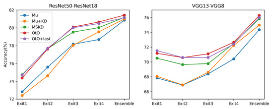 In the multi-teacher KD method in the KD approach [6], the student network can receive guidance from multiple teachers simultaneously. We added a final exit guide of the teacher network to the OtO method, i.e., the early exit of the student network had two teachers: one at the corresponding exit and another at the final exit. This was equivalent to combining the MSKD and OtO methods. Herein, we used a simple average teacher output to instruct the student network, and the results of the experiment are shown in Figure 6.
