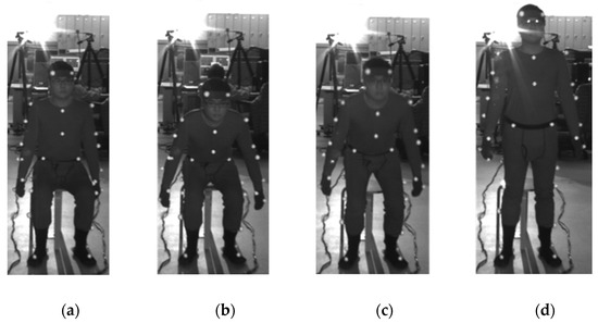 STS measurement experiment. The upper extremity did not touch the body or the outside environment. The plantar was fixed in an arbitrary position that was not interchanged from the beginning to the end of the STS motion. (a) The start of the STS motion from the stationary starting posture at the signal, (b, c) the STS motion in progress, and (d) the end of the STS motion when the ending posture is stationary.