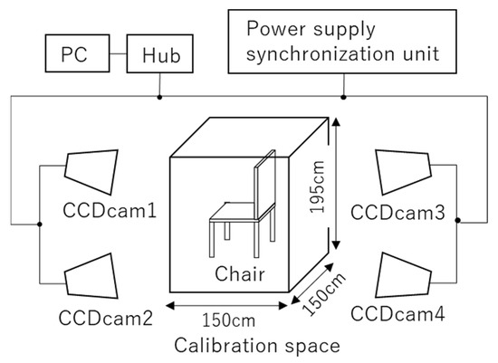 Experimental setup. A calibration space (150 cm × 150 cm × 195 cm) photographed with four CCD cameras.